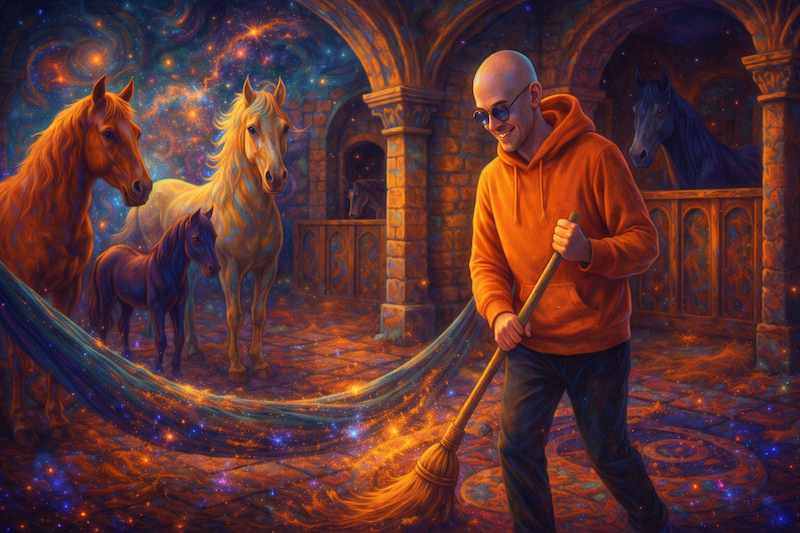 Z czasem jednak zacząłem odczuwać, że coś jest nie tak. Augiasz zawsze znajdował kolejne miejsca do sprzątania i nieustannie twierdził, że to ja robię bałagan. Po paru dniach intensywnej obserwacji wiedziałem już kto jest autorem zamieszania. Dlatego, zamiast się złościć, z uśmiechem dziecka zgadzałem się z jego wersją wydarzeń i dalej porządkowałem stajnie… szukając odpowiedzi, co ja tu właściwie robię… Czy aby to ma sens?