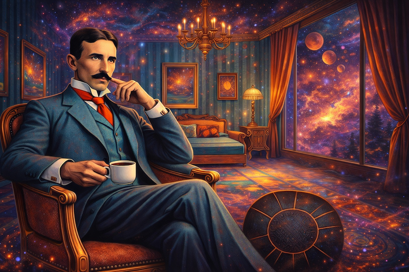 Zgodnie z sugestią boskiej Nike, wybrałem się do pokoju hotelowego nr 3327, w którym mieszkał Nikola Tesla. Gdy tylko otworzył drzwi, poczułem bijącą od niego aurę wielkości — elegancja i intelekt w czystej postaci. Jego oczy błyszczały jak dwie elektryczne iskry, a ruchy były pełne godności. Zachwalał swój pokój, mówiąc, że dzięki niemu nie musi się martwić codziennymi sprawami.
