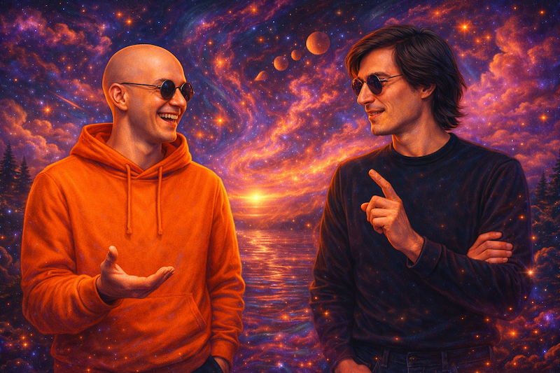 Siedząc w hamaku, pomyślałem jeszcze tylko: Steve i koniec z podróżami… Skoczyłem na hamak z myślą: Jobs help me! No i znowu wtopa. Lądowanie? Tym razem w garażu — tym samym, od którego wszystko się zaczęło. Zapach metalu, rozgrzanych kabli i taniej kawy unosił się w powietrzu. W rogu błyszczały części komputerów, a na stole leżała kartka z pierwszym, pokreślonym logo Apple.