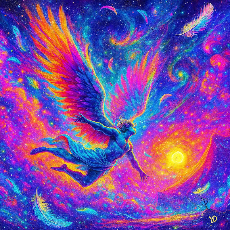 — Jestem Ikar! — jęknął. — Leciałem do słońca, ale od waszego namiotu biło takie ciepło, że pomyliłem kierunek…