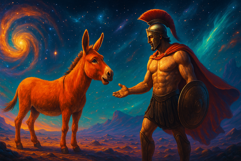 — Jak na gadającego osła, masz w sobie dużo mądrości. Ewidentnie musieli przysłać Cię bogowie. Tak też uczynię. I w ten oto sposób Achilles dołączył do nas jako nowy filozof, a co za tym idzie — nie dotarł do Troi. Nasza historia pozbyła się więc kolejnej wojny, która nikomu nie była potrzebna.
