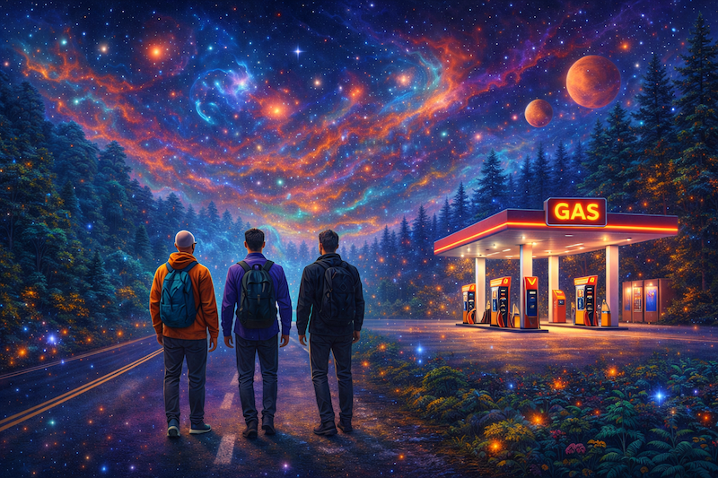 Takim oto sposobem dotarliśmy na stację benzynową, która wydawała się być na końcu świata. Wieczór wydawał się spokojny. Rozbiliśmy obozowisko w pobliskim lesie. Zachód słońca, ciepło i wakacyjny vibe. Wtedy myślałem, że ta noc będzie jak poprzednia, spokojna. Przynajmniej tak mi się wydawało…